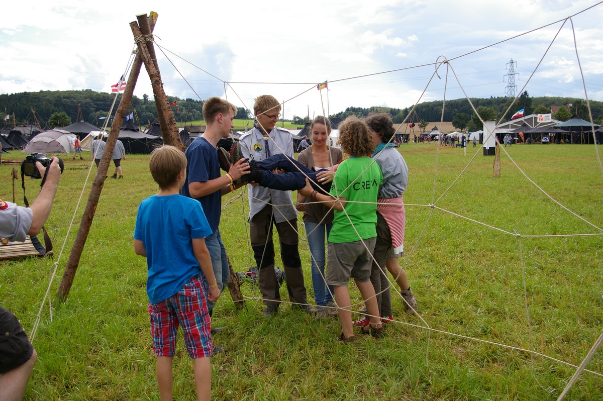 Aufmerksamkeit erregten das Spinnennetz und die Katapulte, beides Aufgaben, mit denen sich Gruppen teilweise mehr als eine Stunde lang beschäftigten. Alle, die mehr als drei Aufgaben bewältigten, nahmen an der täglichen Verlosung eines 100,– Euro Gutscheines für die Burg teil. Außerdem durften sich die Gruppen auf unserem Hingucker – einem 1,50 x 1,50m großen Burglogo verewigen.